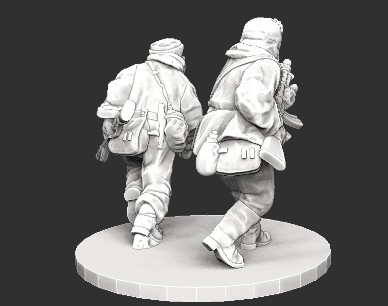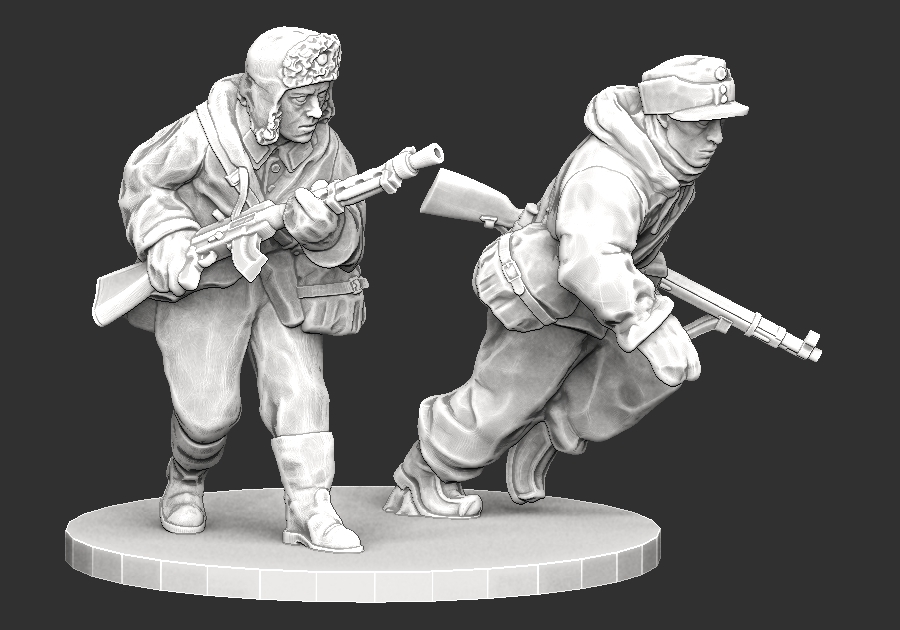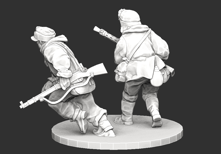 2 infantry miniatures designed to fit 28mm wargames. Due to the bulky nature of minis dressed in winter suits, I recommend printing at 95% scale for those who also have my soviet winter war figures. Round base is not included.
