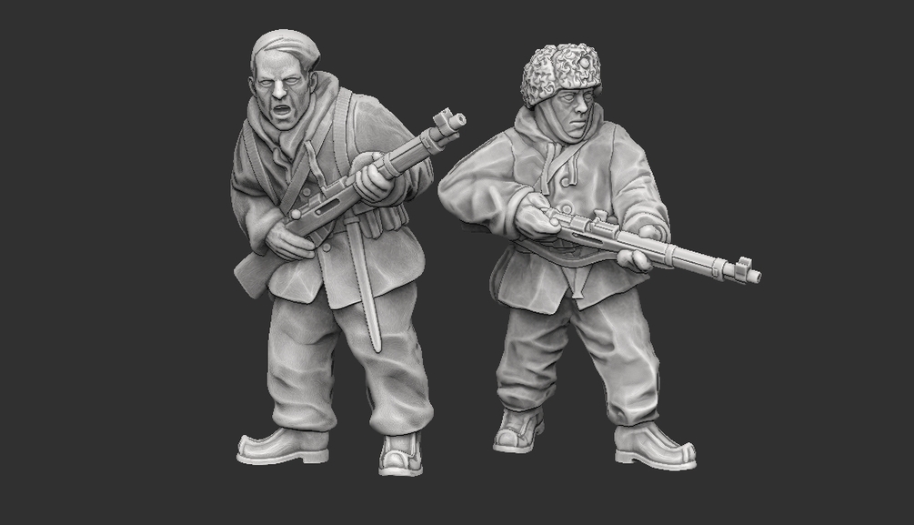 5 infantry models of Finnish Light Infantry designed to fit 28mm wargames. Set consists of 5 regular infantry figures, dressed in snow suits and armed with 4 Mosin rifles, and Suomi smg. NCO is additionally armed in nagant revolver. One of figures has molotov coctail. Models designed to fit Winter War /1939-1940/ period. They can be usefull for winter scenarios during Continuation War. Due to the bulky nature of minis dressed in winter suits, I recommend printing at 95% scale for those who also have my soviet winter war figures.