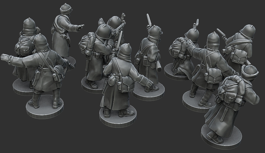 10+1 infantry models redesigned to fit 15mm wargames. Set consists of 9 regular infantry figures armed with Mosin rifles, DP28 LMG and Fedorov Avtomat! Officer is armed in nagant revolver or optional PPD34 SMG